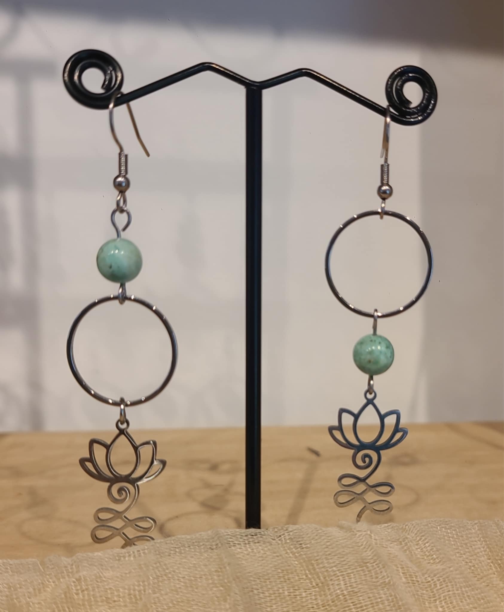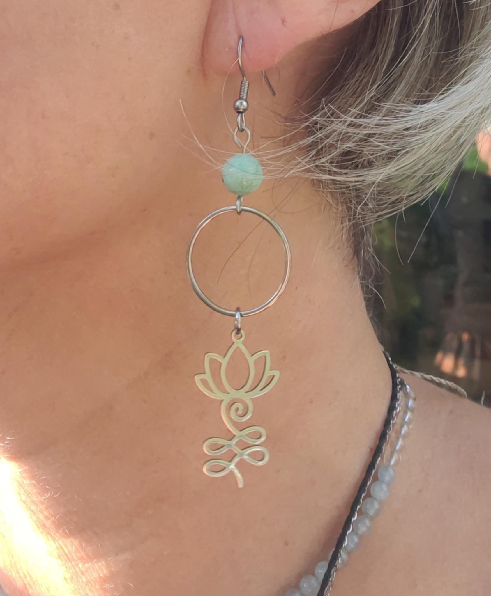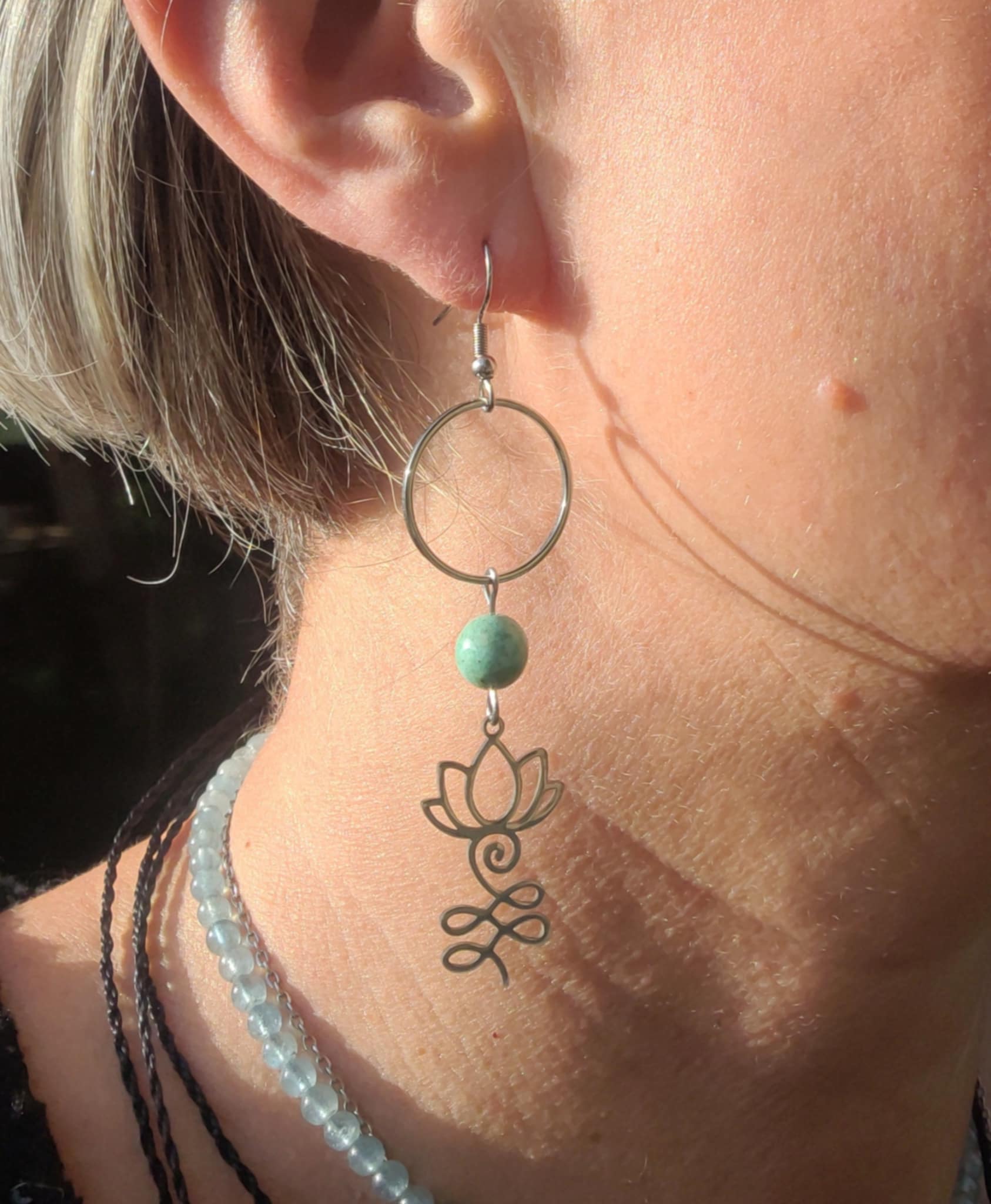 Boucles d’oreilles, tout acier inoxydable, avec des pierres de Turquoise du Pérou et une breloque représentant le symbole de l’Unalome (celui-ci représente le chemin de la vie et de l’éveil spirituel) en acier inoxydable également