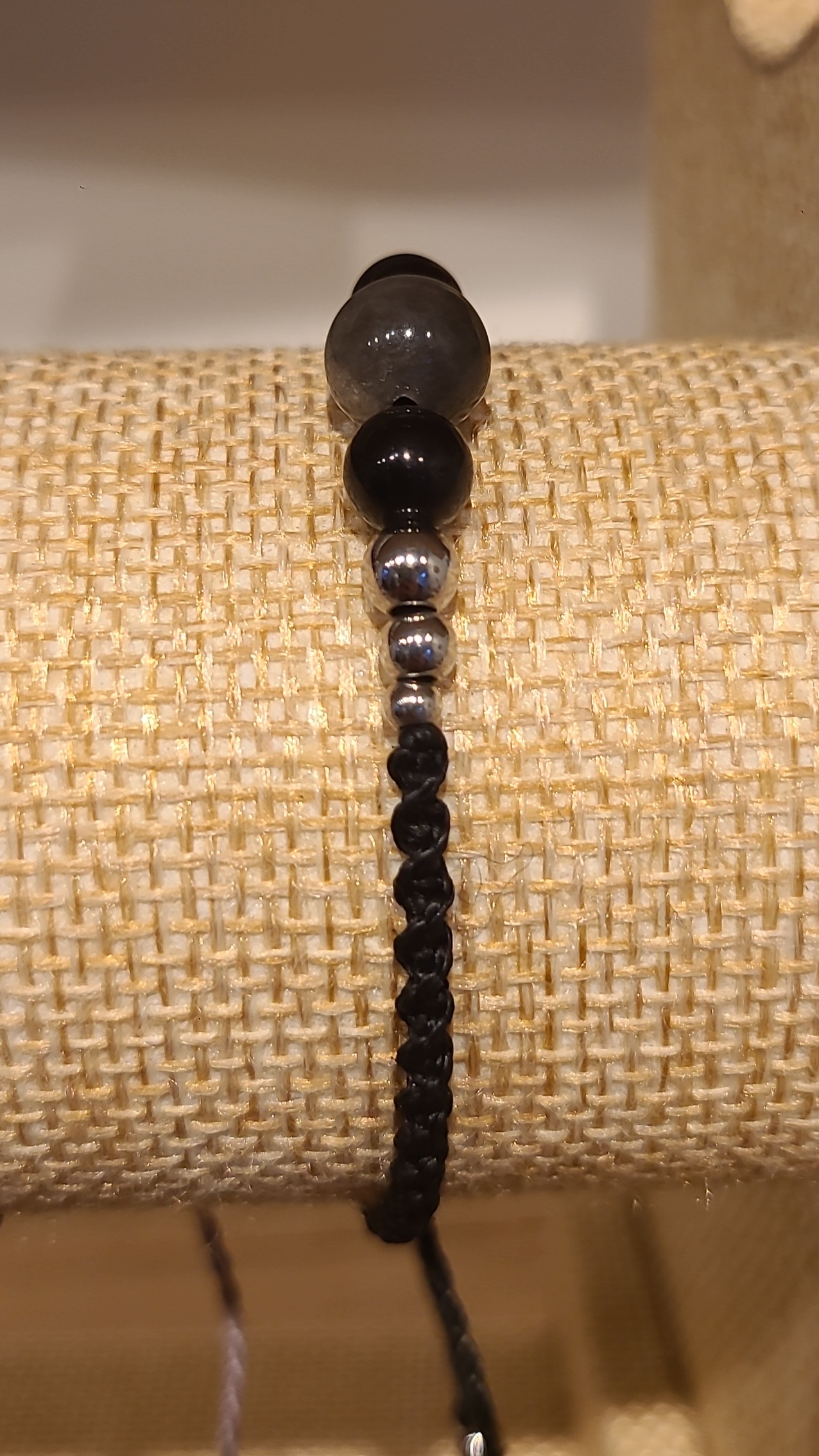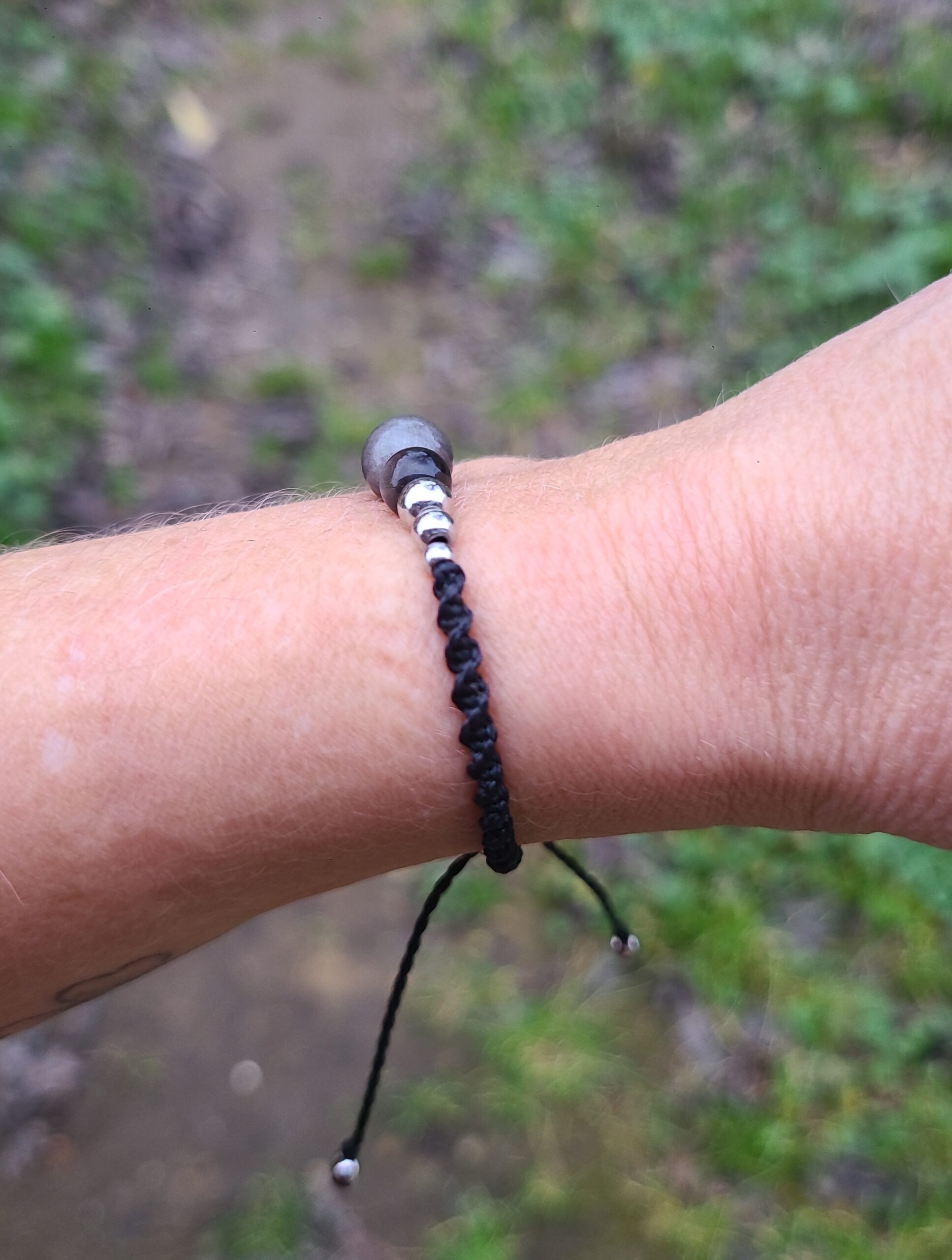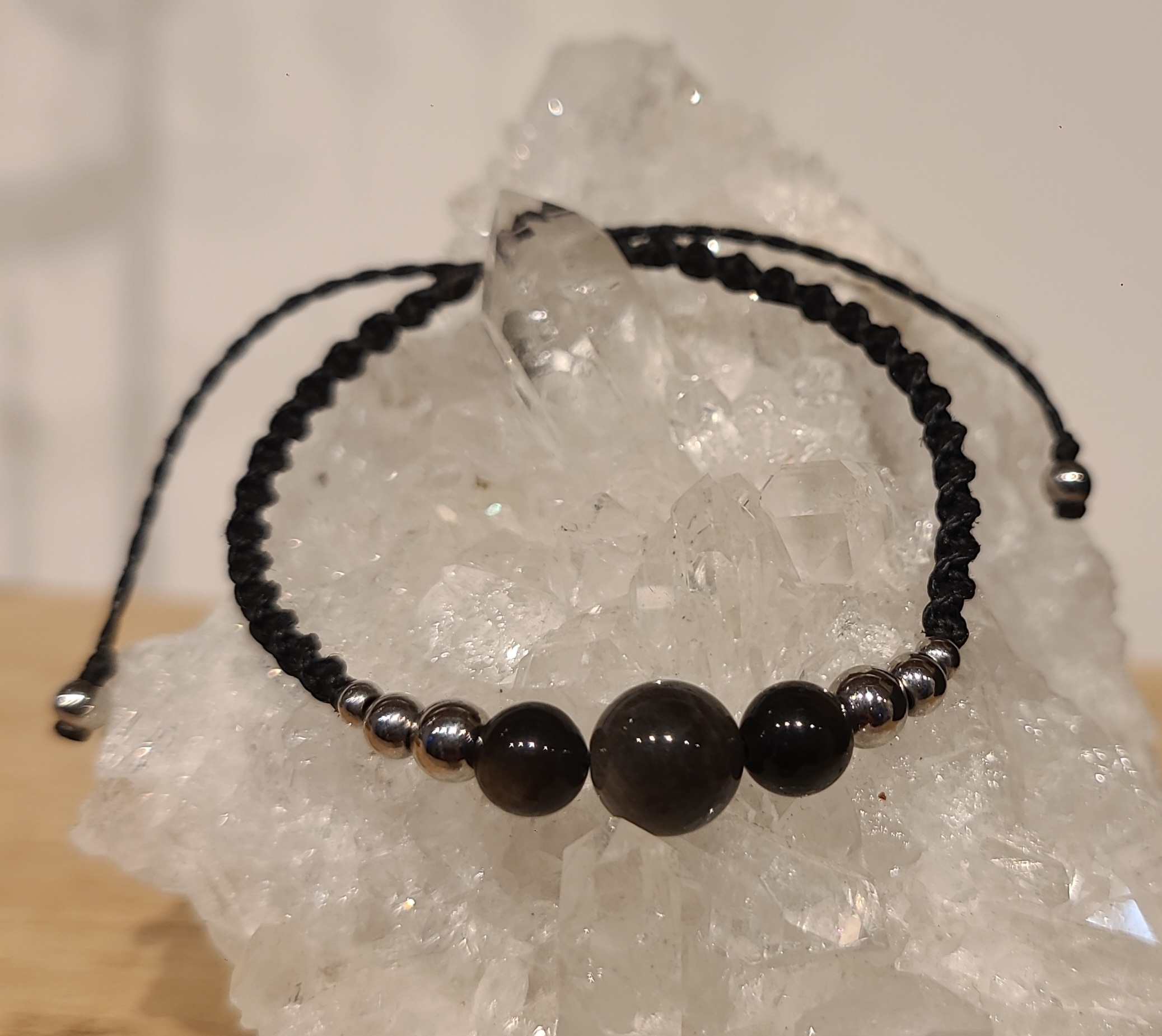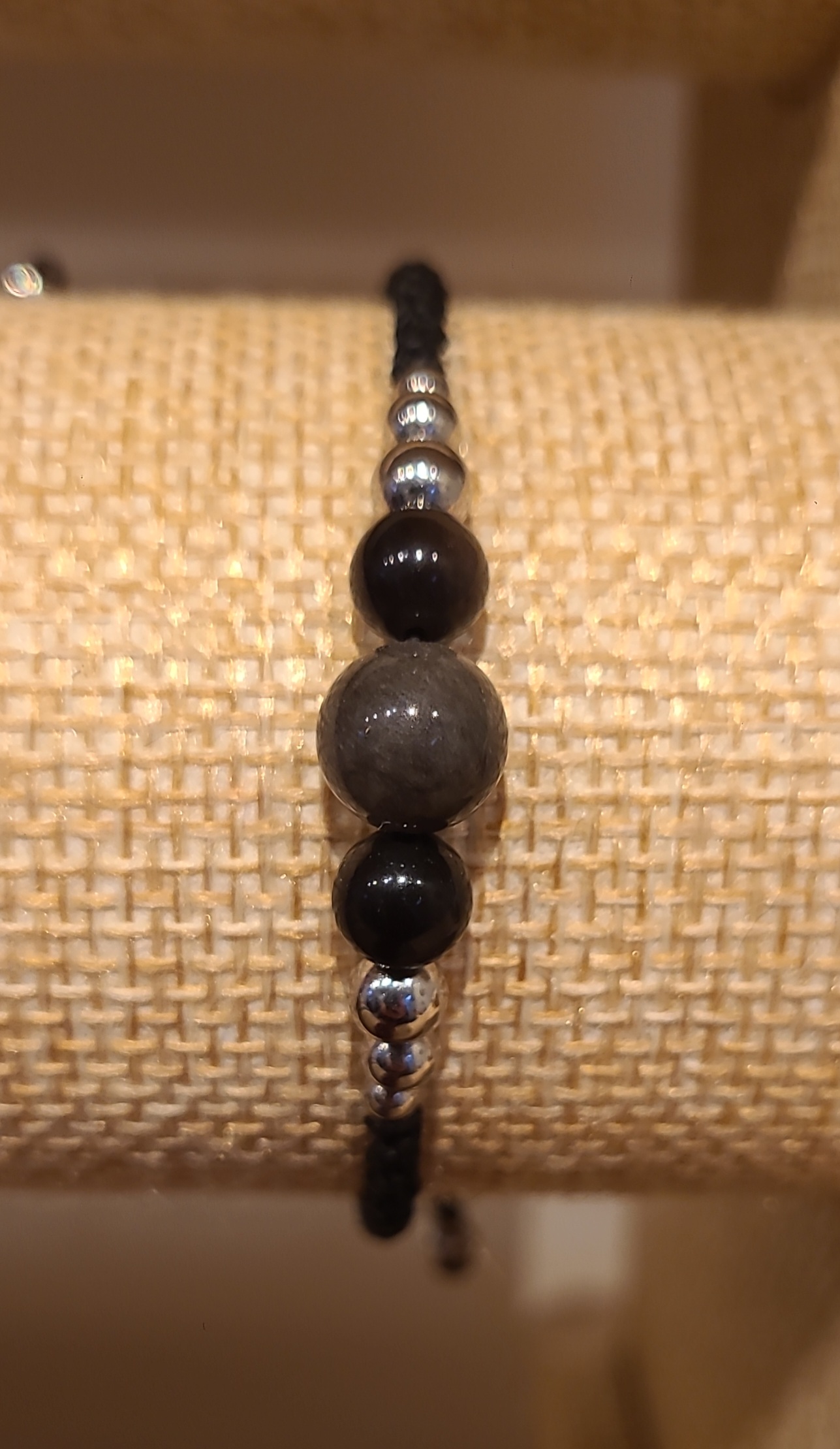 Bracelet en micro-macramé avec des pierres Obsidienne Argentée de diamètre 8 et 6 mm, et de petites perles d’acier inoxydable couleur argentée