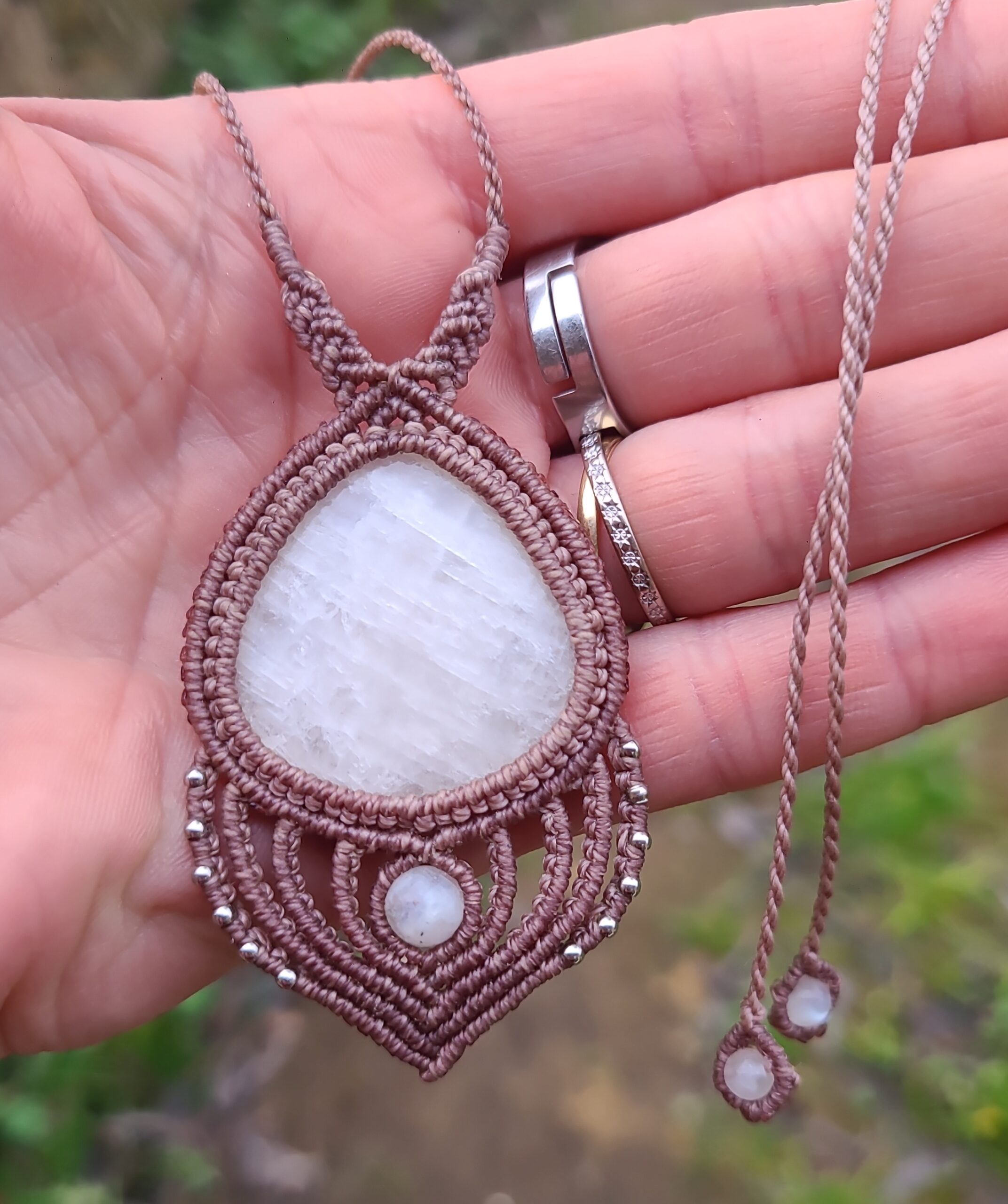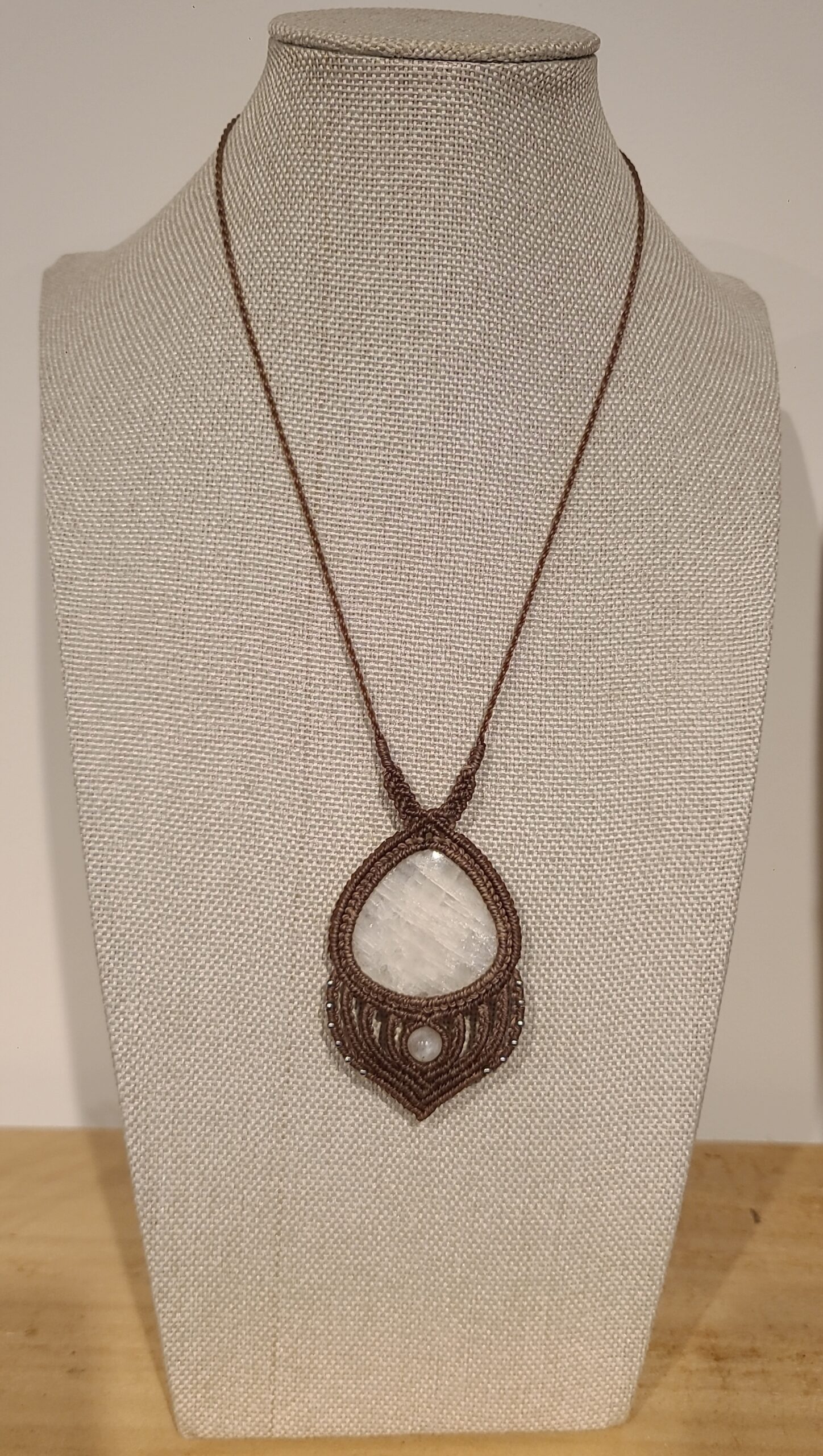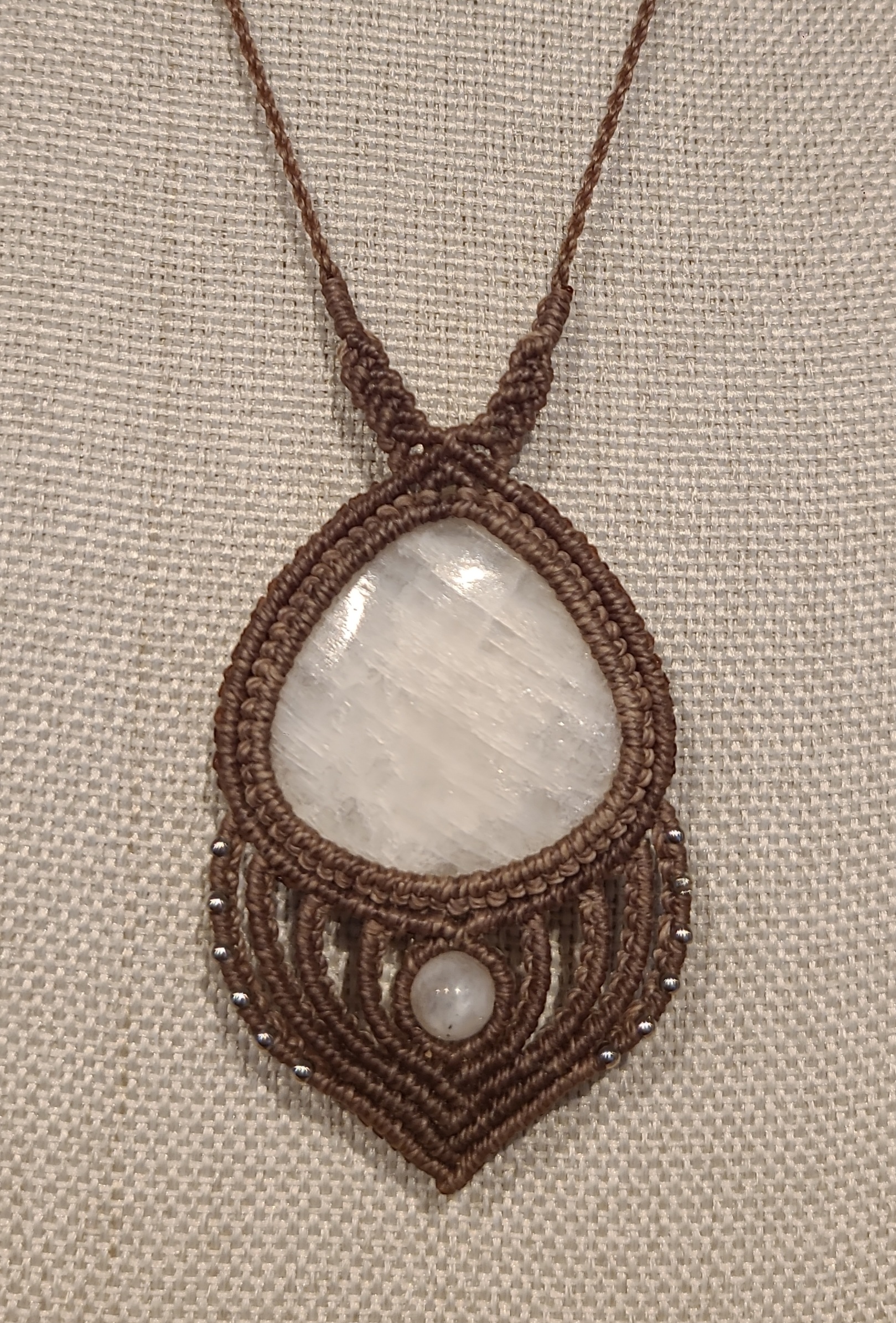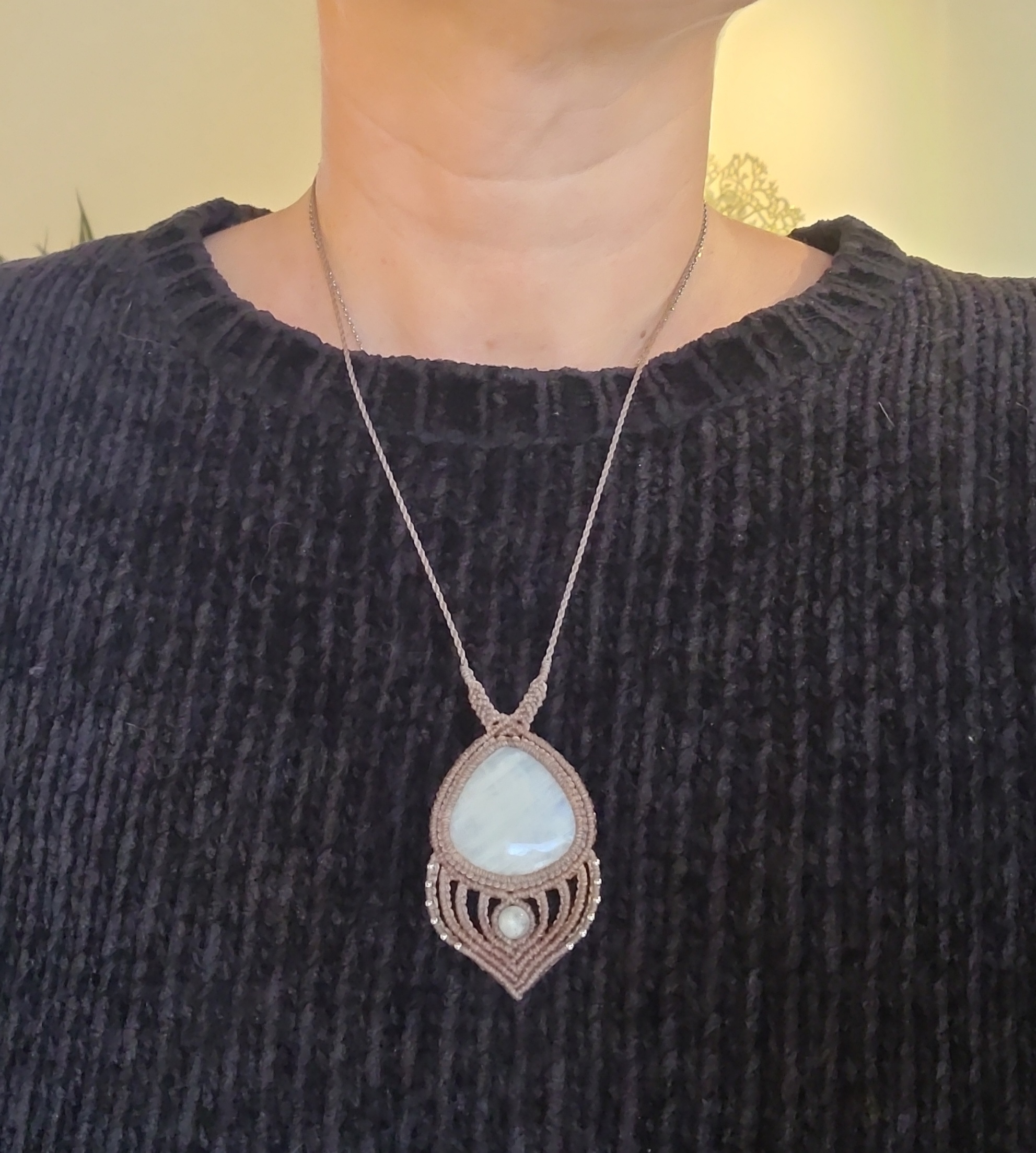 Collier en micro-macramé avec une pierre Pierre de Lune et de petites perles d’acier inoxydable couleur argent