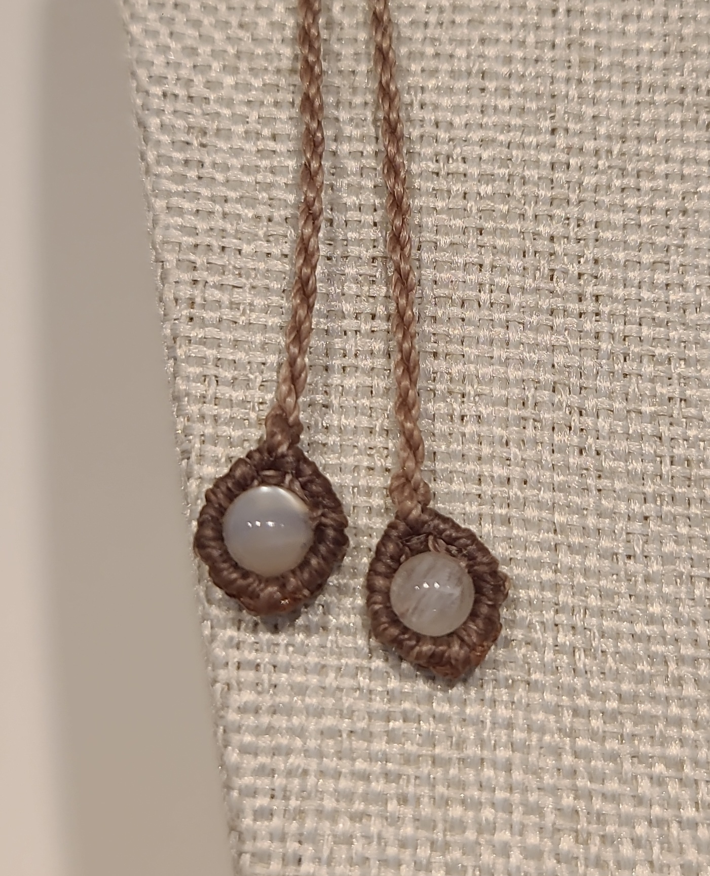 Le cordon est réglable grâce à son nœud coulissant et se termine avec deux petites pierres de Pierre de Lune de diamètre 4mm pour faciliter sa prise en main